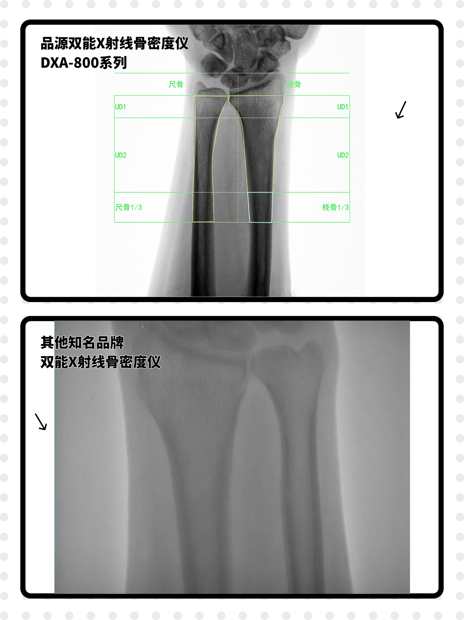 针对临床常见的前臂骨密度检测场景,双能X射线E特别搭载非均匀性校正(NUC)算法,专门对前臂图像进行优化处理。