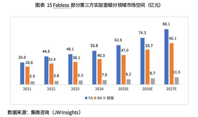 根据集微咨询测算,新增1万片/月产能对应的来自晶圆代工企业的第三方实验室服务市场空间增量约为1000-1500万元,因此2025年该部分市场增量约在12.7亿元左右,且随着已规划产能的逐步释放,预计2026年和2027年该部分市场空间将达到18.7亿元和22.8亿元。