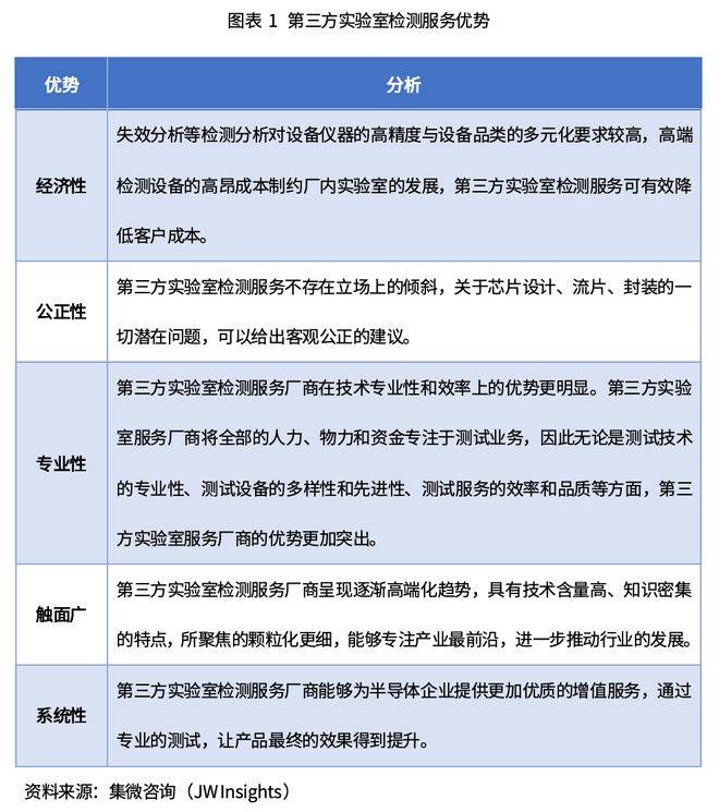 半导体第三方实验室检测服务即由第三方检测实验室为芯片设计企业、晶圆代工企业和封装企业提供服务,在芯片量产之前、量产中均进行严格的验证测试,协助提高芯片生产效率。半导体产能规模化与产品高端化令该市场需求逐渐增加,相较于传统一体化封测厂商与专业第三方晶圆/成品测试,半导体第三方实验室服务具备五重优势。