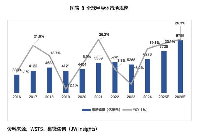 根据 WSTS 数据,全球半导体市场规模在 2016至2024年期间由3389 亿美元提升至 6276 亿美元,复合增长率为8.03%。近年来,人工智能浪潮下大模型的快速发展推动了智算中心及边缘端、终端等应用场景需求不断增长,2025 年全球半导体市场规模预计同比增长 23.0%,有望达到 7725 亿美元。2026 年全球半导体市场规模将突破 9755 亿美元,同比增长超 25%,逼近万亿美元大关。
