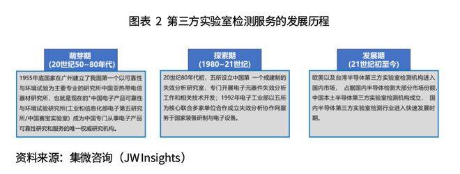 中国大陆半导体第三方实验室服务的发展历程主要可以划分为3个阶段。20世纪50-80年代,1955年底中国亚热带电器器材研究所在广州成立,即现在的赛宝实验室;20世纪80年代初,五所成立中国第一个成建制的失效分析实验室,专门开展电子元器件失效分析工作和相关技术开发;21世纪初开始,欧美、中国台湾地区等第三方检测机构进入中国大陆市场,并占据中国半导体检测大部分市场份额,中国本土民营第三方检测机构也开始诞生发展,本土半导体第三方实验室服务机构成立,国内半导体第三方实验室服务行业进入快速发展时期。