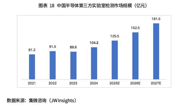 随着人工智能(AI)、5G等关键技术持续落地的推动下,半导体产业需求快速增长,国内半导体第三方实验室检测服务市场也迎来强劲扩张,市场前景广阔。集微咨询预计,2025年中国半导体第三方实验室检测服务市场规模将达到约125.5亿元,至2027年有望进一步增至181.5亿元。