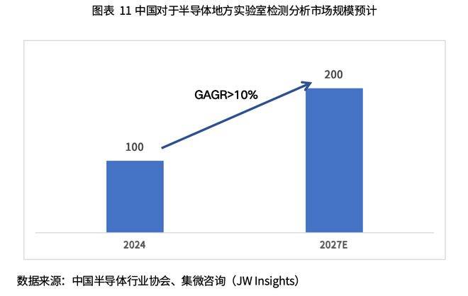 随着国内半导体产业的发展,国内半导体第三方实验室检测分析市场环境日益成熟,市场竞争也日趋激烈。根据中国半导体协会数据,预计到 2024 年,我国半导体第三方实验室检测分析市场规模将超过 100 亿元,2027 年行业市场空间将有望达到 180-200 亿元。